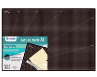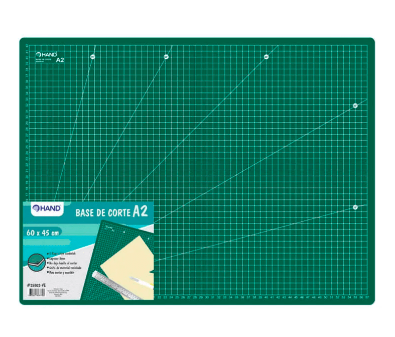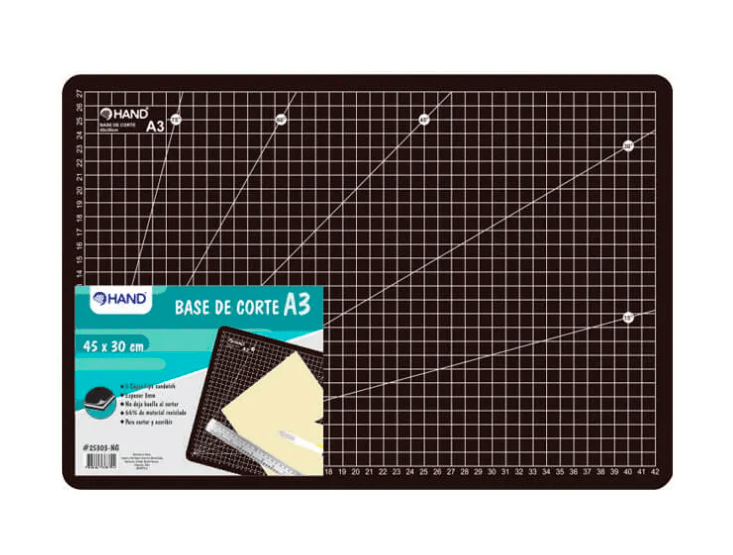 La base de corte de Hand está compuesta de silicona blanda y tiene una superficie cuadriculada de 3 mm de espesor que permite realizar cortes sin poner en riesgo la integridad de la mesa o tablero sobre el que trabajes. Tiene líneas en diferentes ángulos para poder realizar todo tipo de cortes. Además, un 66% de su composición es de material reciclado.